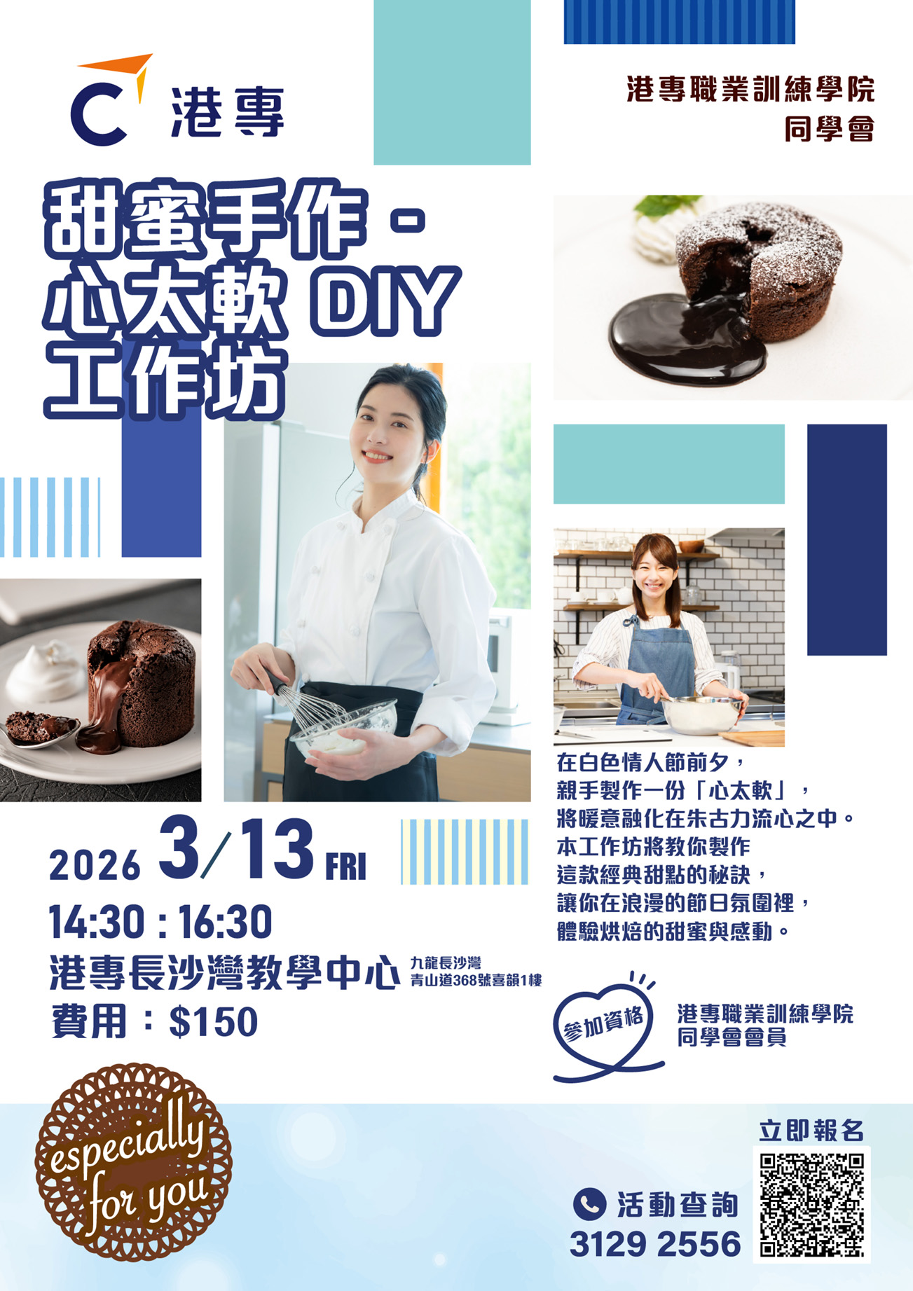 在白色情人節前夕,親手製作一份「心太軟」,將暖意融化在朱古力流心之中,讓你在浪漫的節日氛圍裡,體驗烘焙的甜蜜與感動。日期:2026年3月13日 (星期五)時間:14:30 - 16:30地點:港專長沙灣教學中心對象:港專職業訓練學院同學會會員費用:$150立即報名